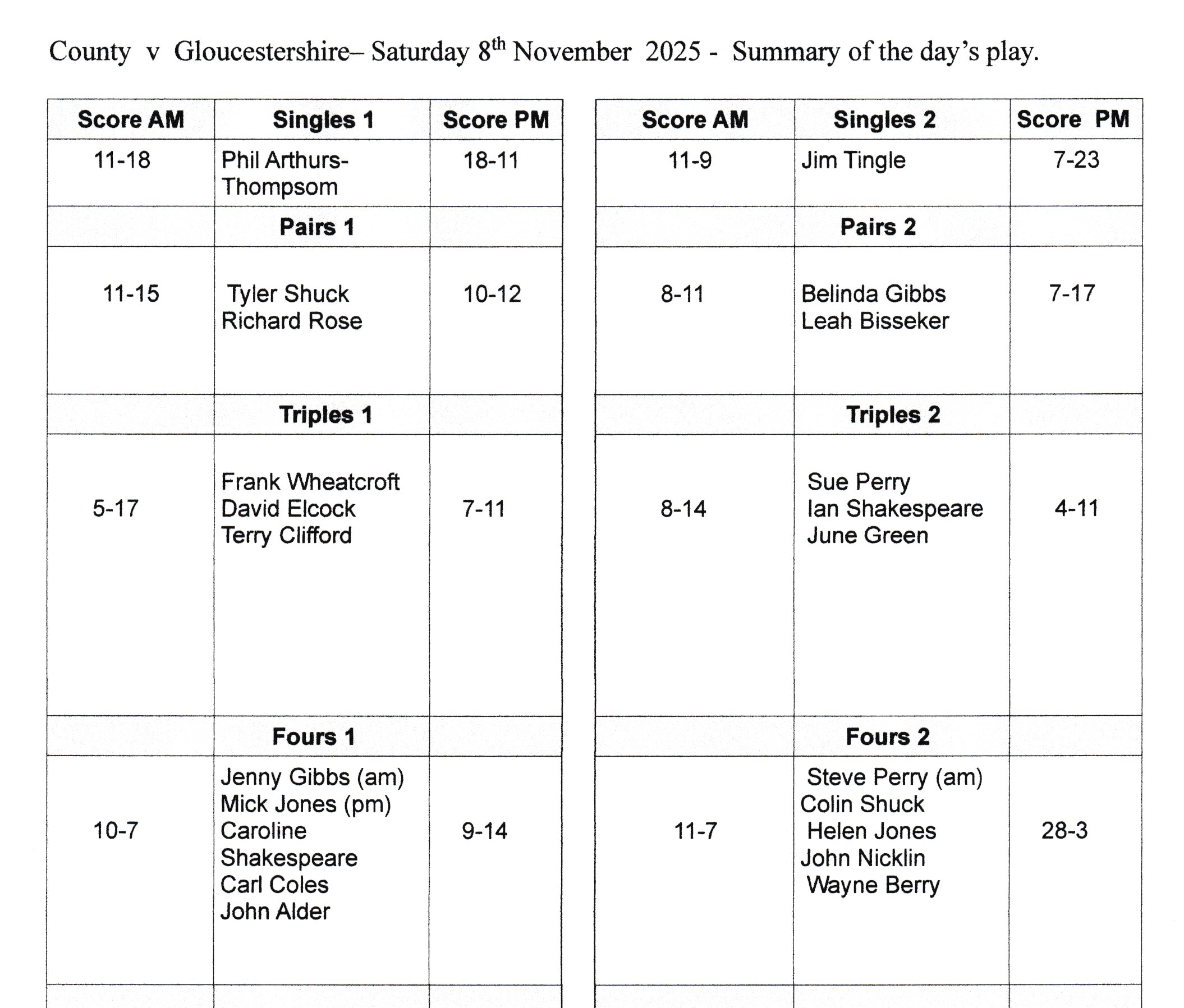 During the afternoon session Phil Arthurs-Thompson took the lead in the 8th end, maintained that lead for the remainder of the game, winning by 18 shots to 11. In the Pairs, Tyler Shuck and Richard Rose were heading for victory, leading 10-9 going into the final end. A strong response from Gloucestershire saw them snatch victory away from Tyler and Richard, with Gloucestershire winning by 2 shots. In the Fours, Wayne Berry’s team were exceptional. They won 10 of the 11 ends played, accumulating a massive total of 28 shots compared with Gloucestershire’s 3.