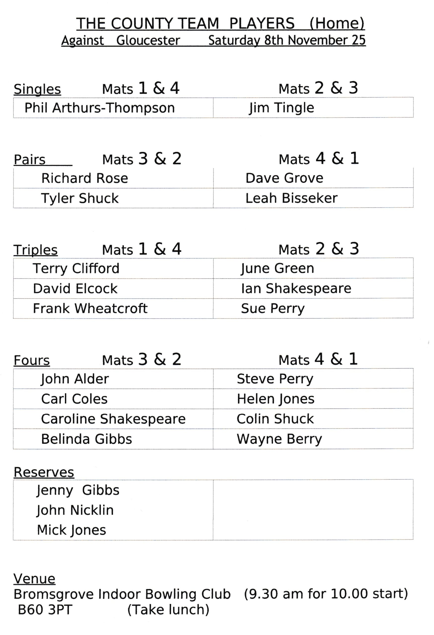 The morning session saw Jim Tingle win 11-9 having been ahead throughout his Singles game. In the Pairs Tyler Shuck and Ricard Rose were in the lead for 12 of their 15 end game. Gloucestershire, however, fought back strongly in the final three ends to win 15-11. There was another close Pairs game with Belinda Gibbs and Leah Bisseker leading 8-7 after the 13th end, only to lose 8-11 in the 15th . John Alder’s Fours team won their game 10-7 having led throughout the game. Wayne Berry’s Fours team also won. The team were behind for the first half of the game, level 7-7 after the 8th end, and then going on to win the final 3 ends to run out winning 11 shots to 7.
