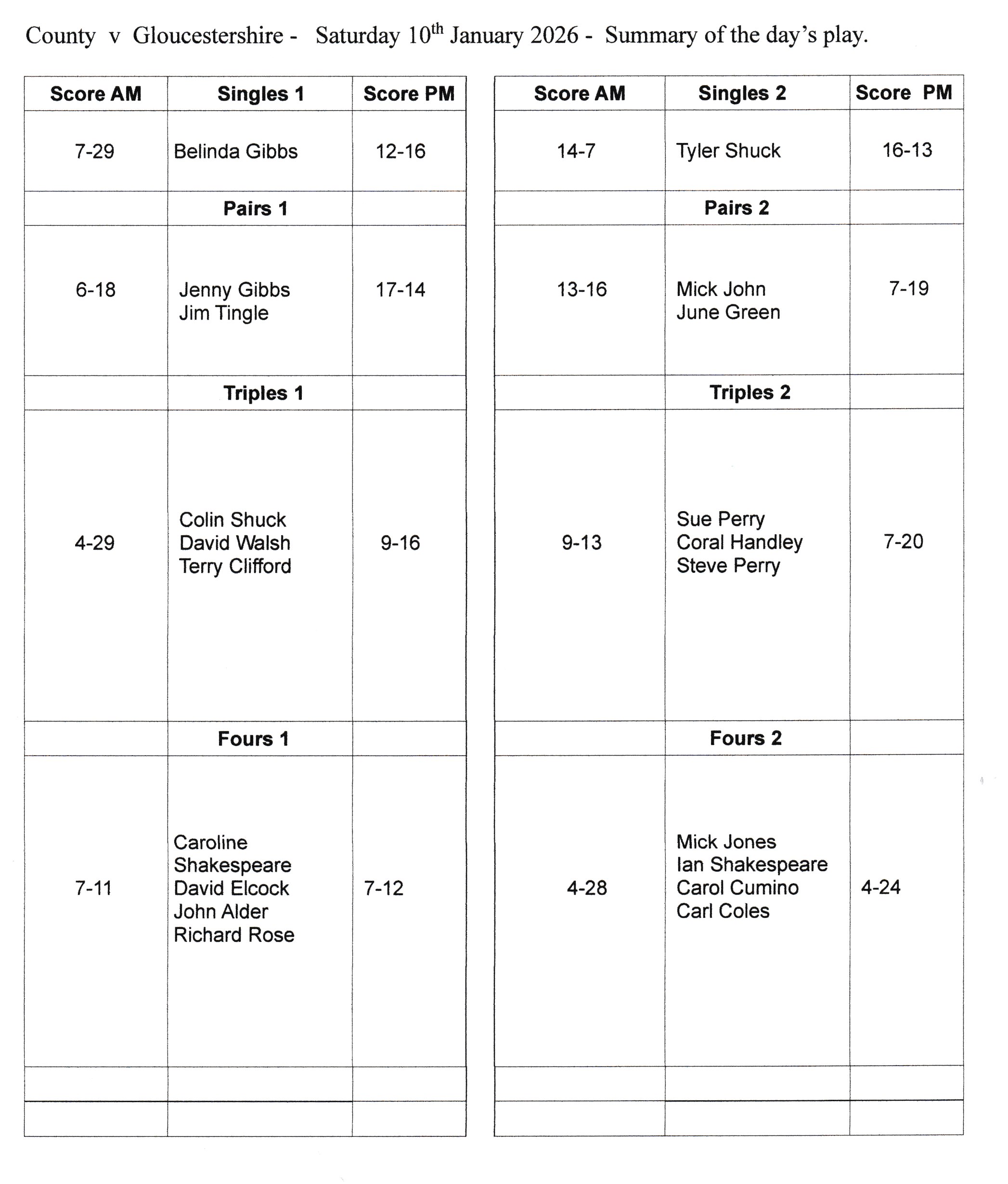 This away fixture ended with  Worcestershire losing by 6 points to 34. Worcestershire scored 139 shots with Gloucestershire scoring 276. There was one highlight for the county during the day with Tyler Shuck scoring 4 of Worcestershire’s 6 points. In the first game of the day Tyler led throughout the game to ensure a comfortable 14-7 win. In the afternoon game, Tyler was behind his opponent after  the third end until drawing level 13-13 during the 14th end. Tyler finished the final end superbly by winning three shots to achieve an overall win 16-13. Tyler at the age of 14 has really made his mark for the county. The other success was a win for Jenny Gibbs and Jim Tingle in their afternoon Pairs game. This was a close contest with Jenny and Jim drawing level  14-14 going into the final end which they won convincingly by 3 shots to win overall 17-14.
