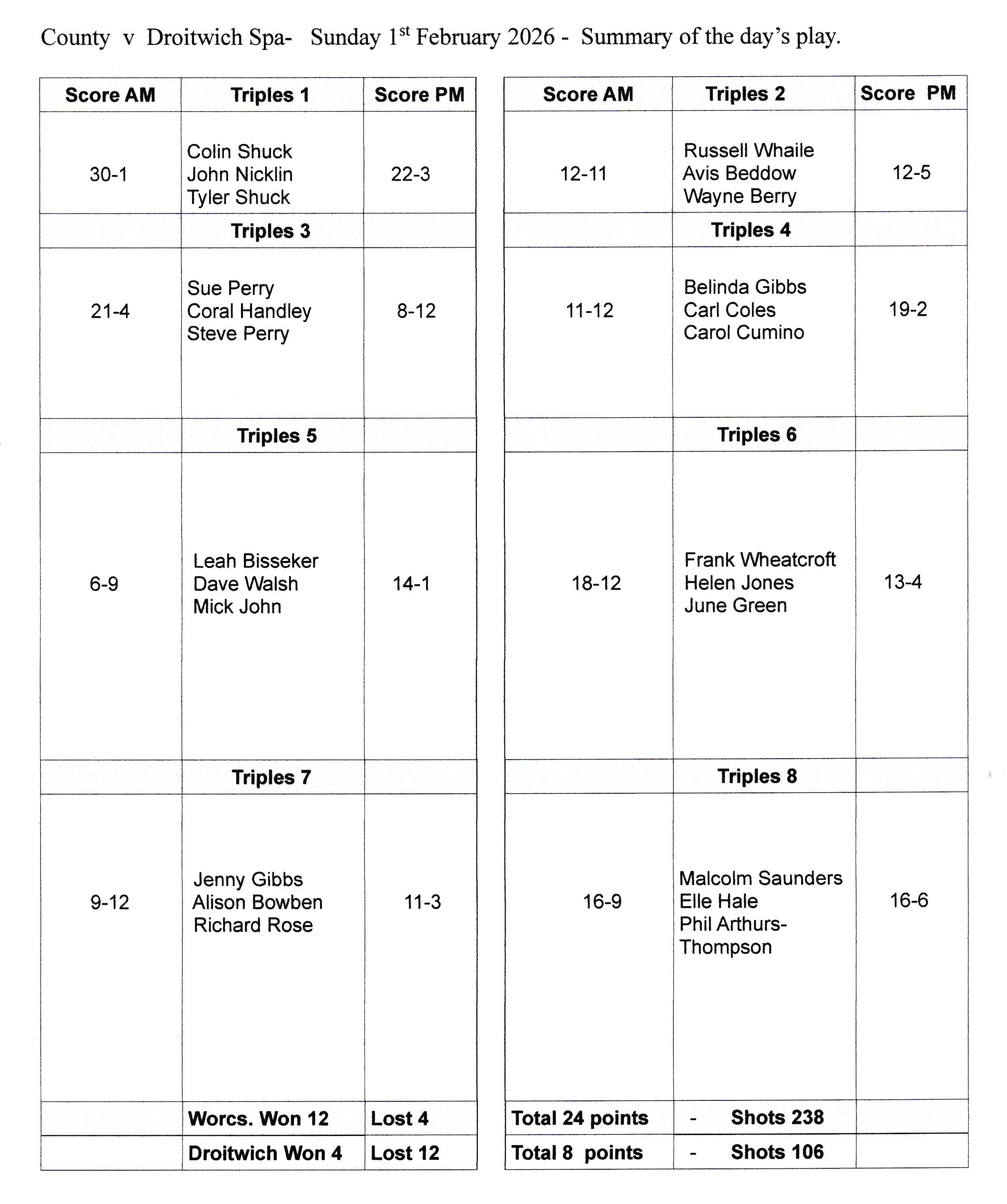 Worcestershire hosted a friendly match at Bromsgrove on the 1st February 2026, against Droitwich Spa Bowls Club. This was an all triples match  –  2 woods per bowler in the morning and 3 bowls in the afternoon. A total of 16 individual games was played. Worcestershire won 12 of these games and Droitwich Spa 4.  Total shots were 238 for Worcestershire and 108 for Droitwich Spa.