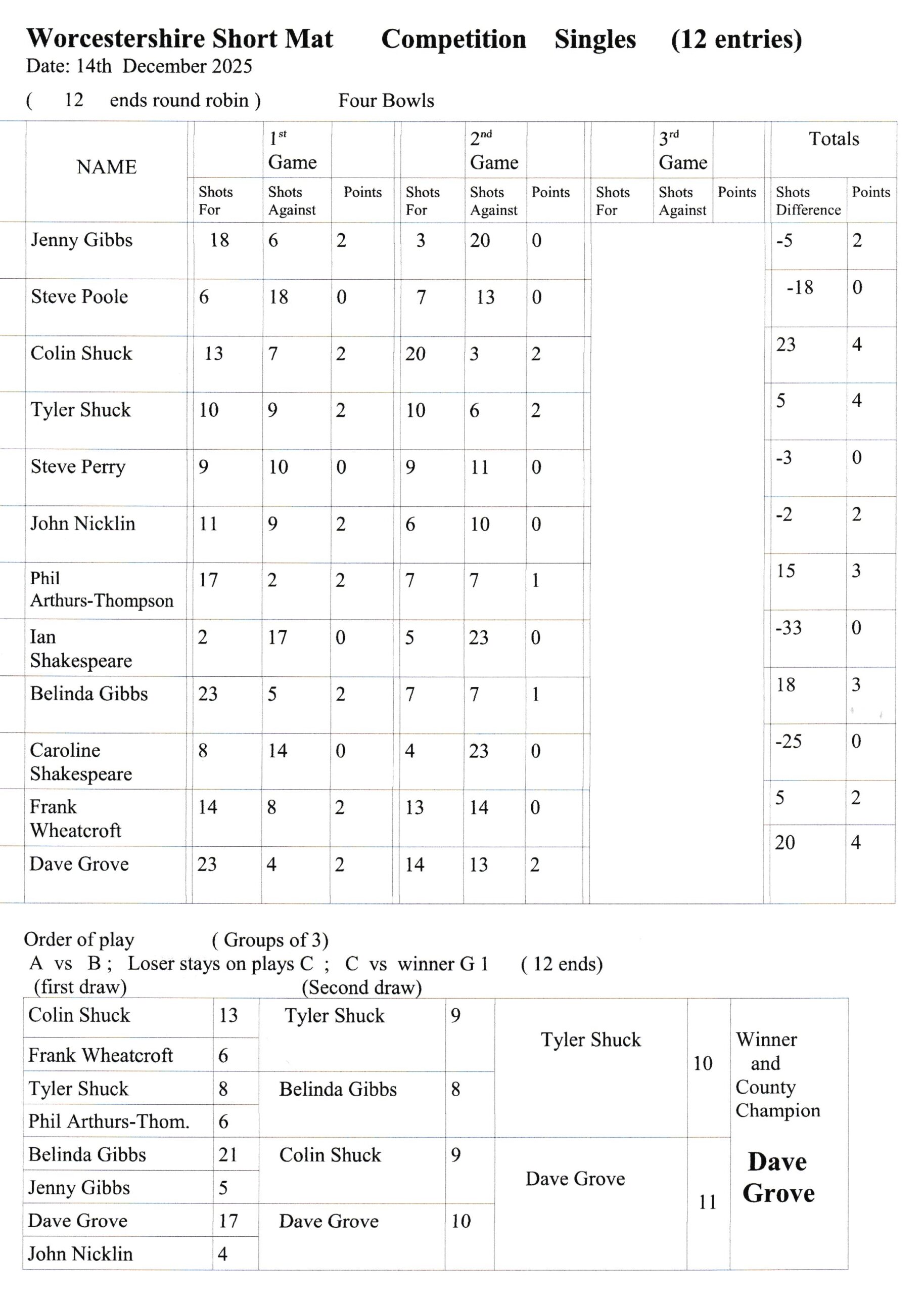 COUNTY SINGLES HELD AT BROMSGROVE ON SUNDAY 14TH DECEMBER 2025.