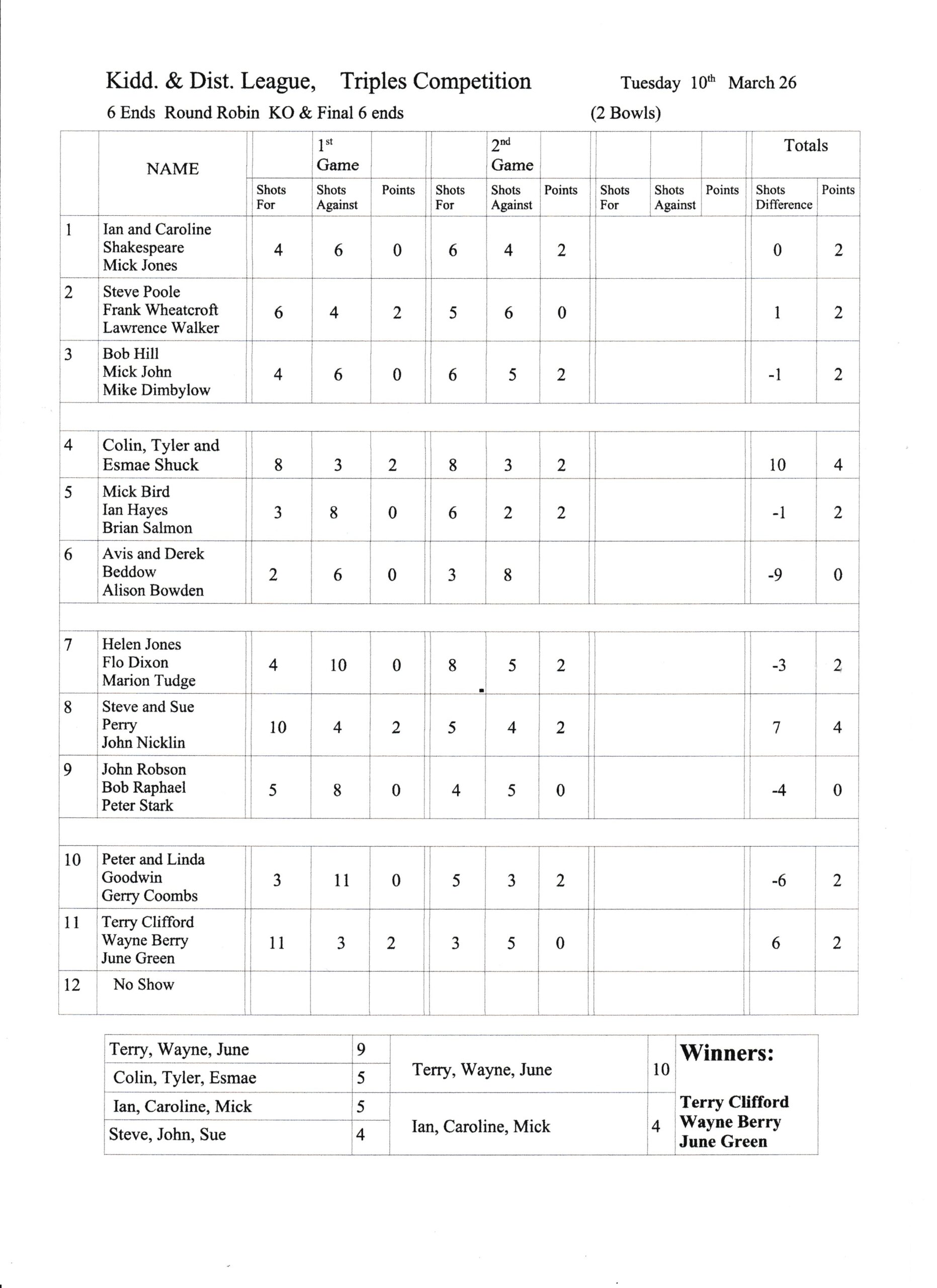 TRIPLES – PLAYED 12TH MARCH 2026.