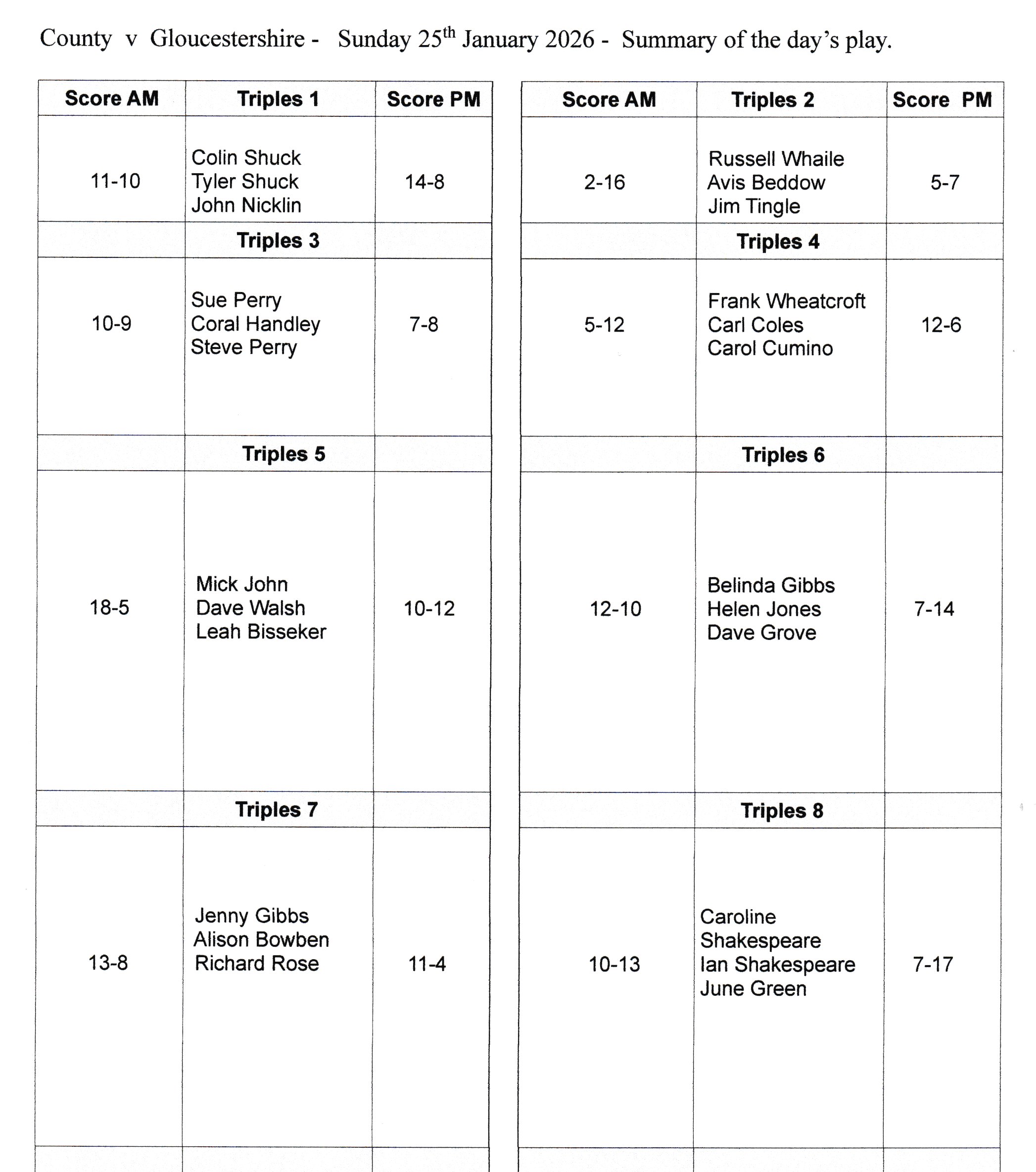 The match was closely contested with Worcestershire winning eight of the sixteen individual triples matches played with the points score level on 16-16. The shot difference was also very close with Worcestershire scoring 154 shots to Gloucestershire’s 159. The second leg will be played at Kingsway, Gloucester on Saturday 28th March.