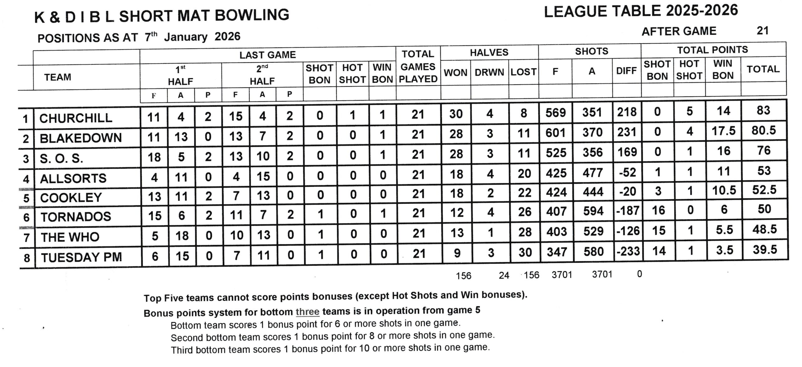 The results of the games played on Tuesday 6th January, and the impact on the league table, are shown below :