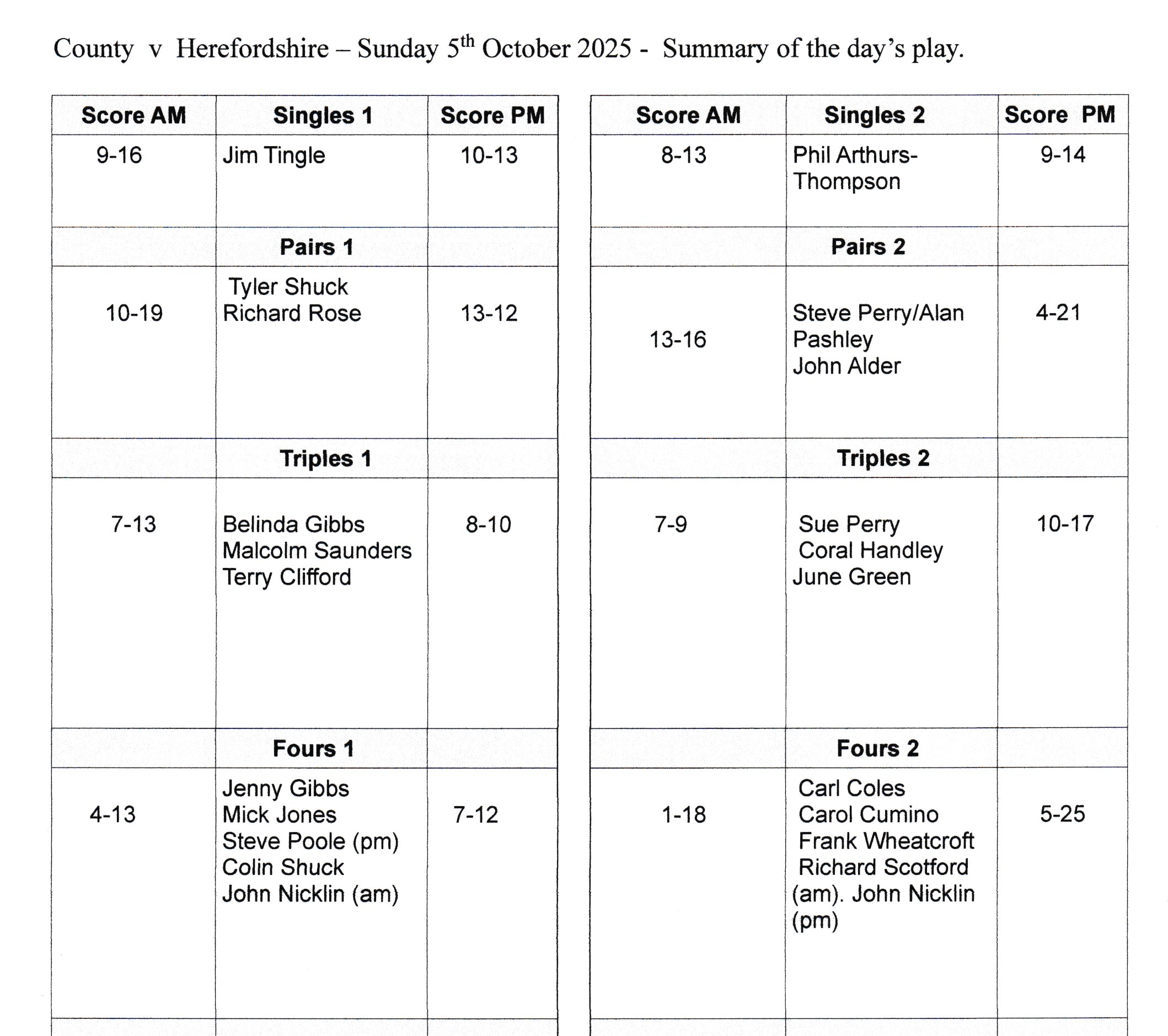 This first county contest of the 2025/2026 ESMBA inter county competition took place at Bromsgrove on Sunday 5th October 2025. Unfortunately Worcestershire suffered a heavy defeat scoring only two points compared with 38 for Herefordshire. The county scored 125 shots with Herefordshire scoring 241.